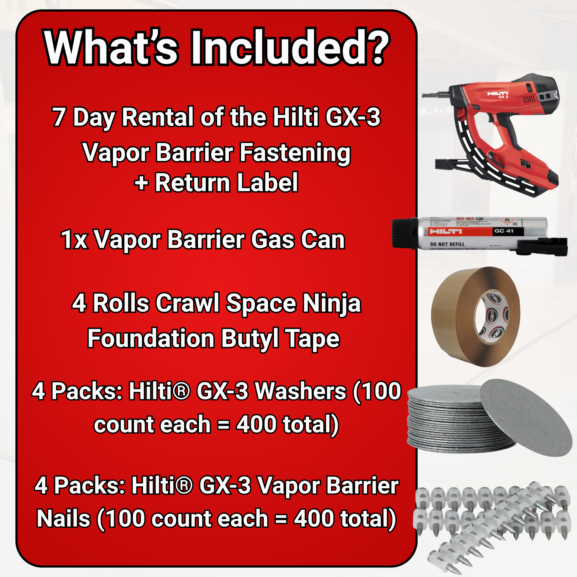 This all-in-one bundle includes everything you need to permanently fasten vapor barrier or Insul-Barrier to your crawl space walls and pillars. No guessing or piecing together parts — we’ve packaged the Hilti® GX-3 rental tool with all essential supplies so you can get the job done efficiently and professionally.