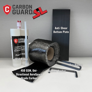 Built around Advanced “Shear Lock” Anchoring Technology, the Carbon Guard™ system features a 450 GSM, uni-directional aerospace-grade carbon fiber strap paired with top and bottom mechanical anchors for a complete, permanent solution. The anti-shear bottom plate resists lateral wall movement, while the 4055 epoxy ensures a rock-solid bond between the strap and your wall surface.