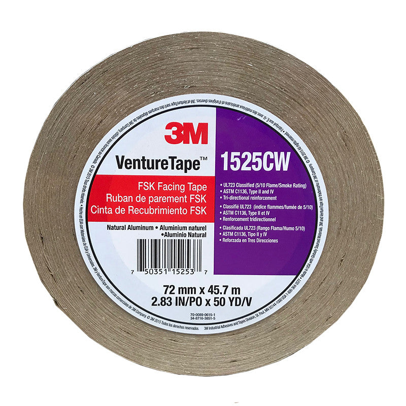 3M™ Venture Tape™ FSK Facing Tape 1525CW matches FSK faced insulation board and duct. It is a foil/scrim/kraft (FSK) laminated taped coated with a pressure sensitive, cold weather solvent acrylic adhesive. This tape combines quick stick at normal temperatures with superior low temperature performance. It conforms well to fibrous ductboard and blankets.