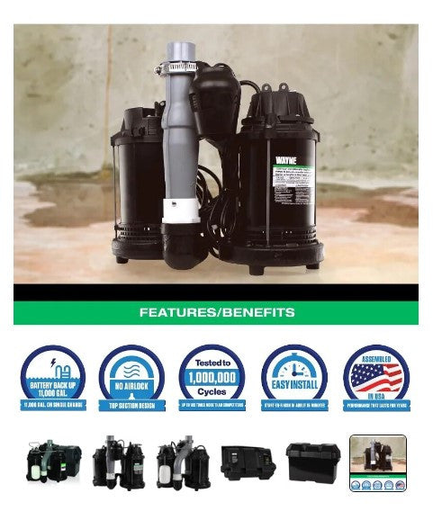 Wayne 1/2 HP Combo Battery Backup System, Vertical Float Switch, Coated Steel & Cast Iron